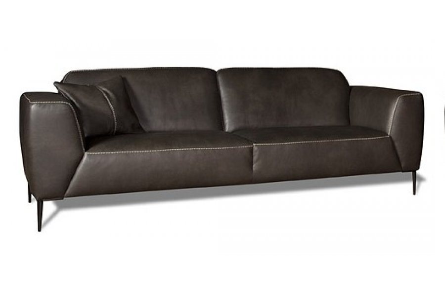 Deef is een moderne bank hoog staand op zijn poten en met een robuust contrast stiksel afgewerkt.