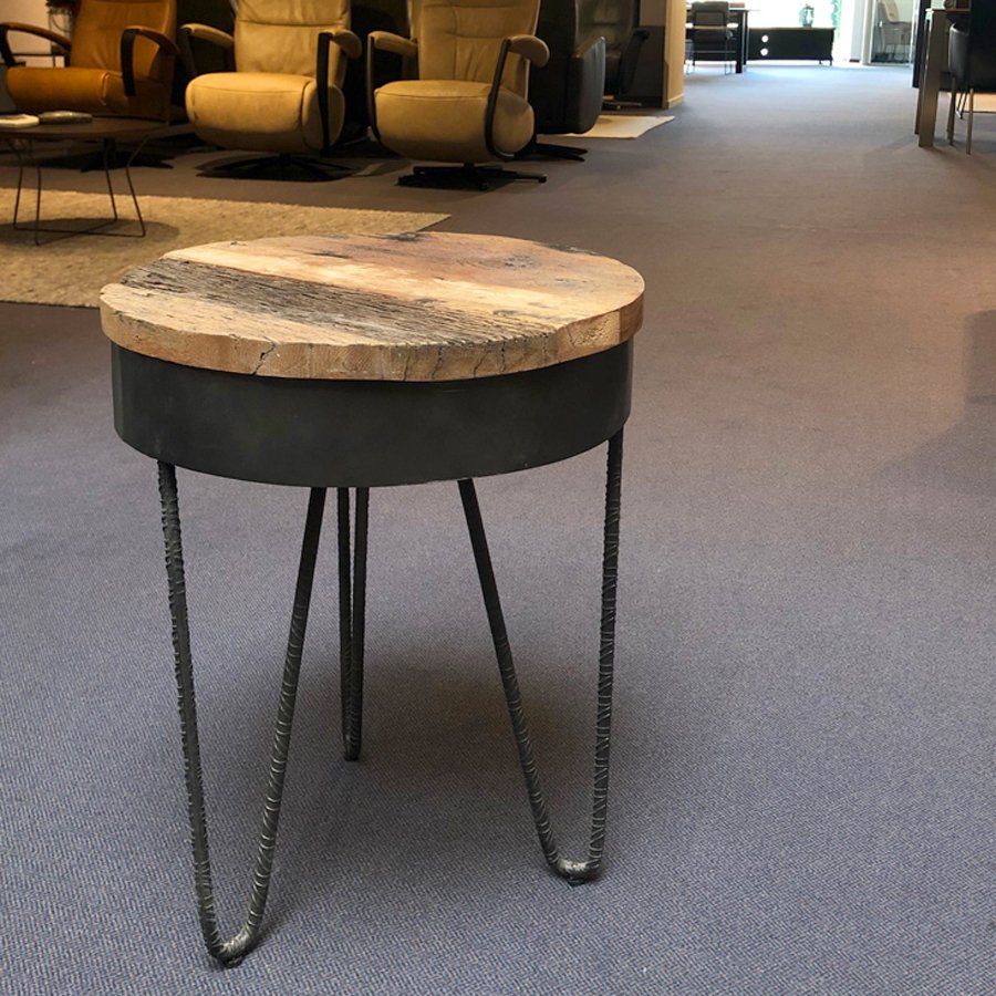Luso is een bijzettafel van gerecycled hout met een industriëel onderstel.