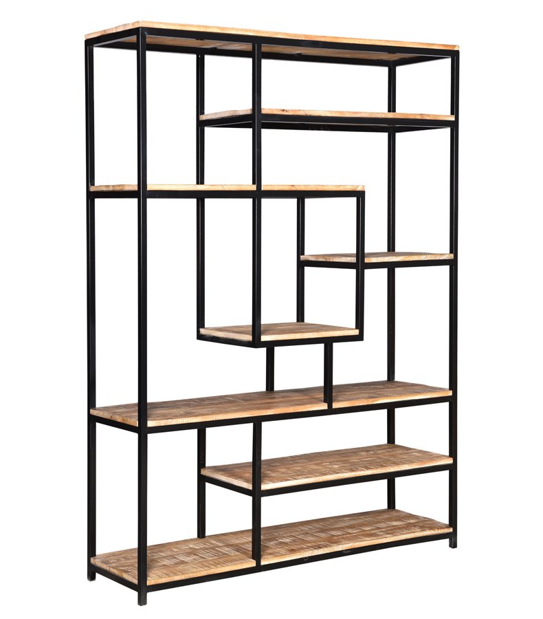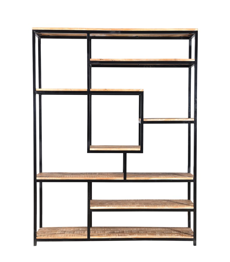 Een open boekenkast van mangohout gecombineerd met zwart staal.