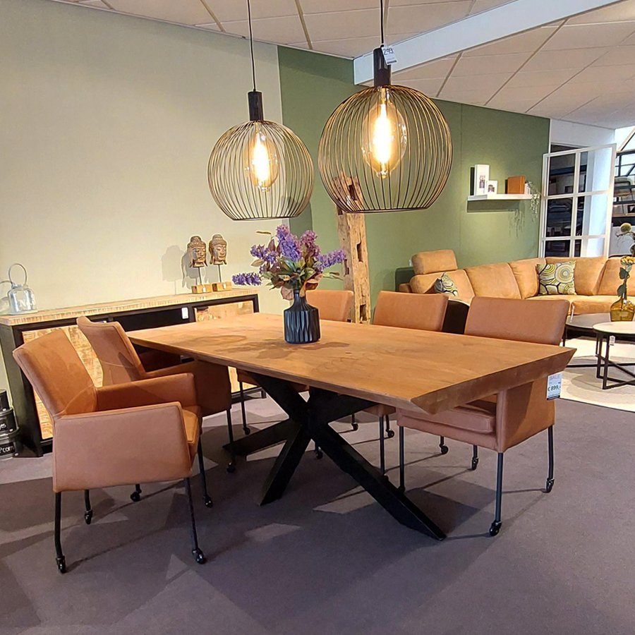 Deze mangohouten eetkamertafel is een prachtige toevoeging bij uw industriële woonstijl.