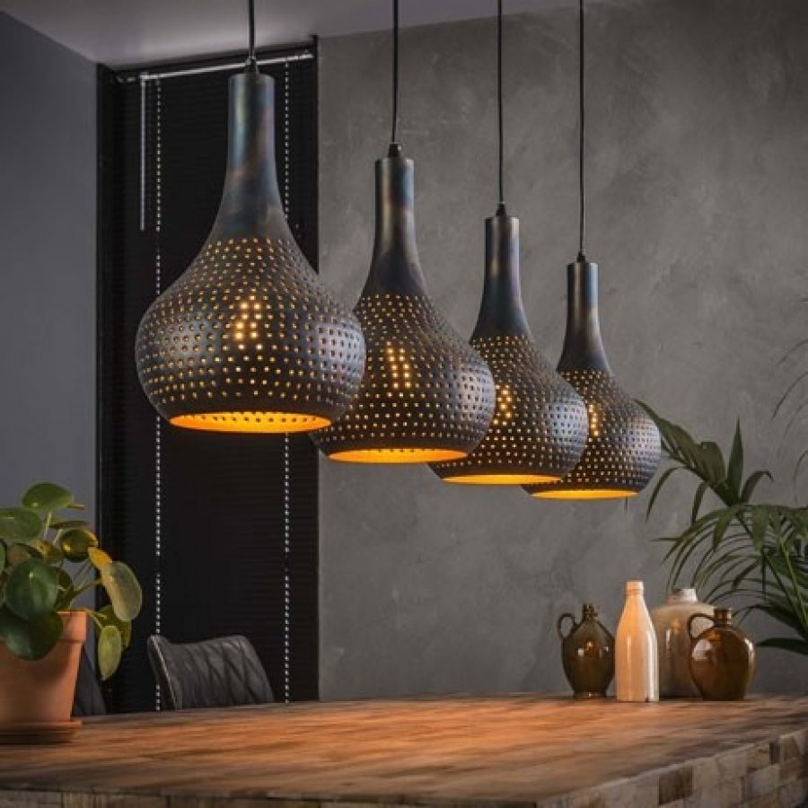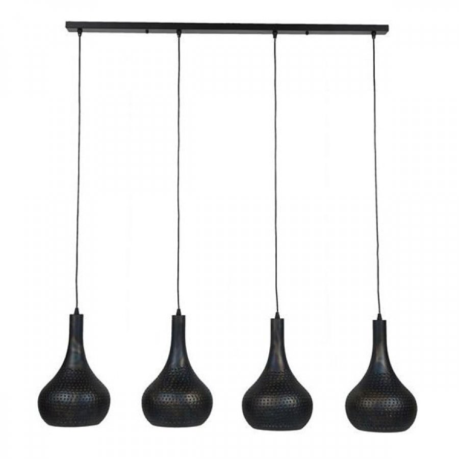 Hanglamp uitgevoerd in 4 kappen, leverbaar in grijs of zwart/bruin metaal.