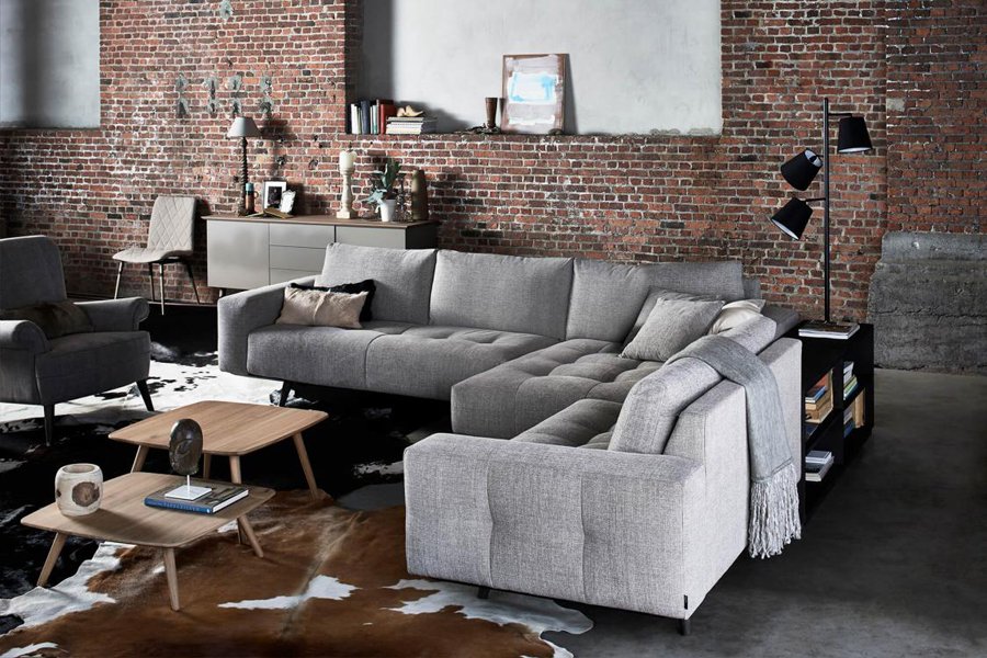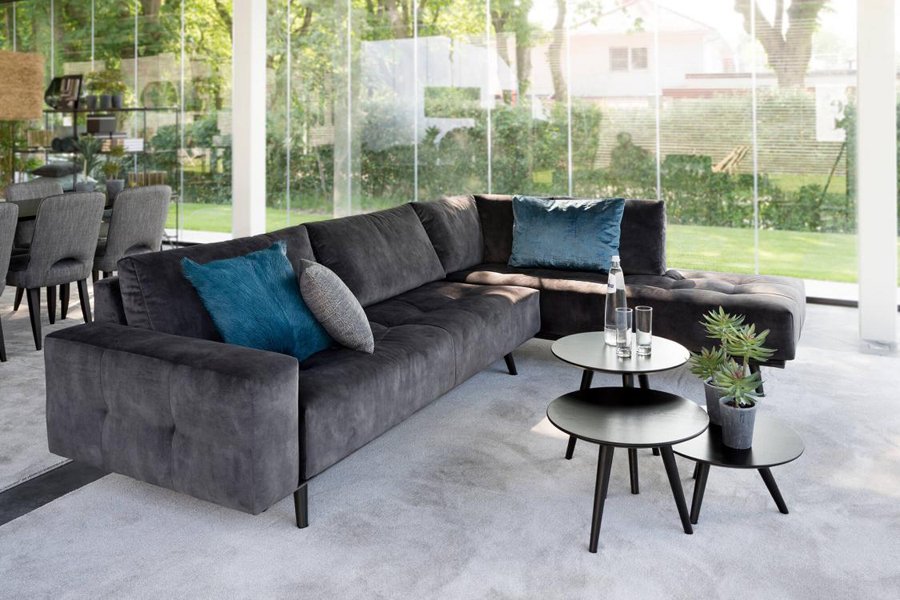 De bank staat hoog op zijn poten wat hem een open uitstraling geeft.