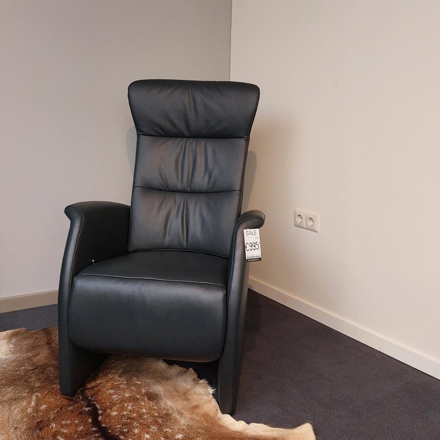 Fauteuil uit onze toonzaal is uitgevoerd in blauw leder en maat S.