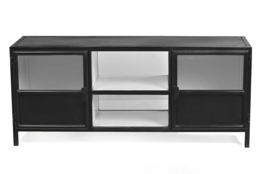 De kast heeft twee deuren waarvan de bovenste helft van elke deur van glas voorzien is en twee open vakken.